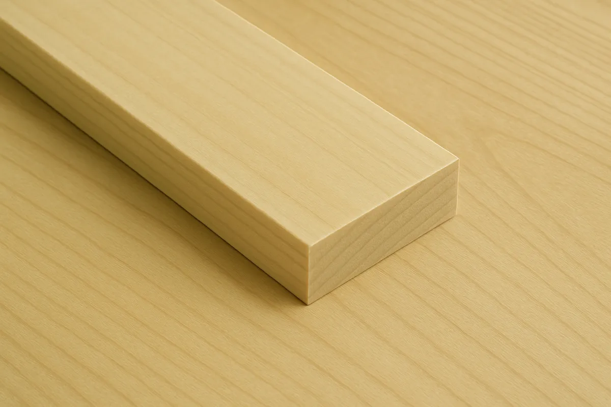 Maple is a dense and durable hardwood, typically light in color with subtle grain patterns that can range from straight to wavy or birdseye figuring. It is known for its strength and resistance to wear, which makes it popular for flooring, butcher blocks, and work surfaces. Maple can be challenging to stain evenly due to its tight grain, but it finishes smoothly and is often used for contemporary furniture and cabinetry.